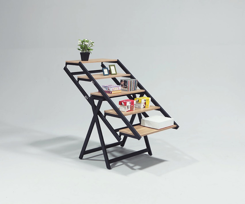 採用符合國際標準低甲醛防蛀木心板 腳座:黑砂粉體烤漆五金架 餐桌:附安全扣固定開關 餐桌可當書架使用,有效利用空間. |